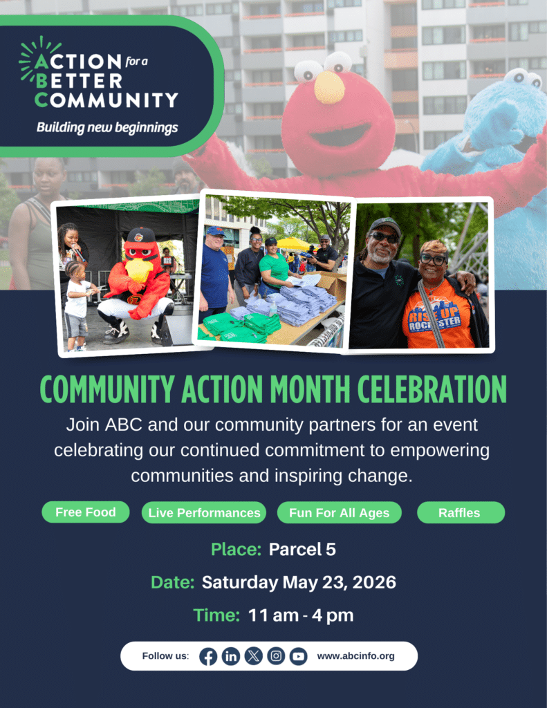 2026 Community Action Month Celebration + Add to Google Calendar + iCal / Outlook export Date May 23 2026 Time 11:00 - 15:00 Location Parcel 5 285 E Main St, Rochester, NY 14604 Organizer Mubarak Bashir Email mbashir@abcinfo.org Share this event